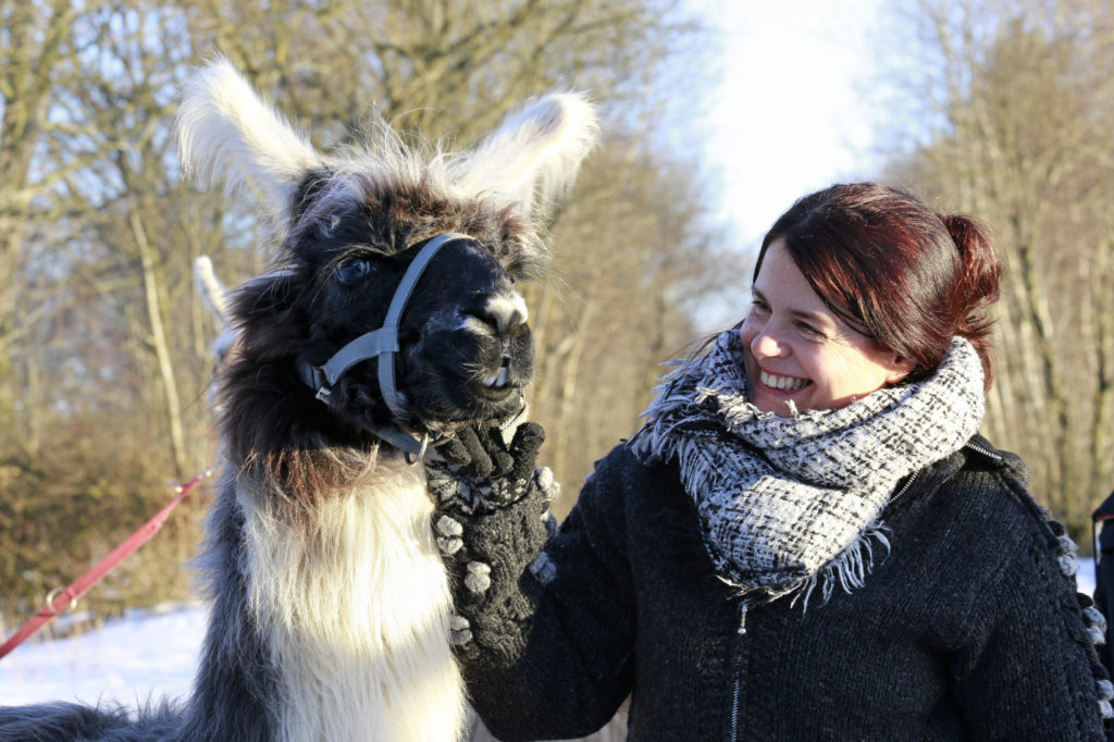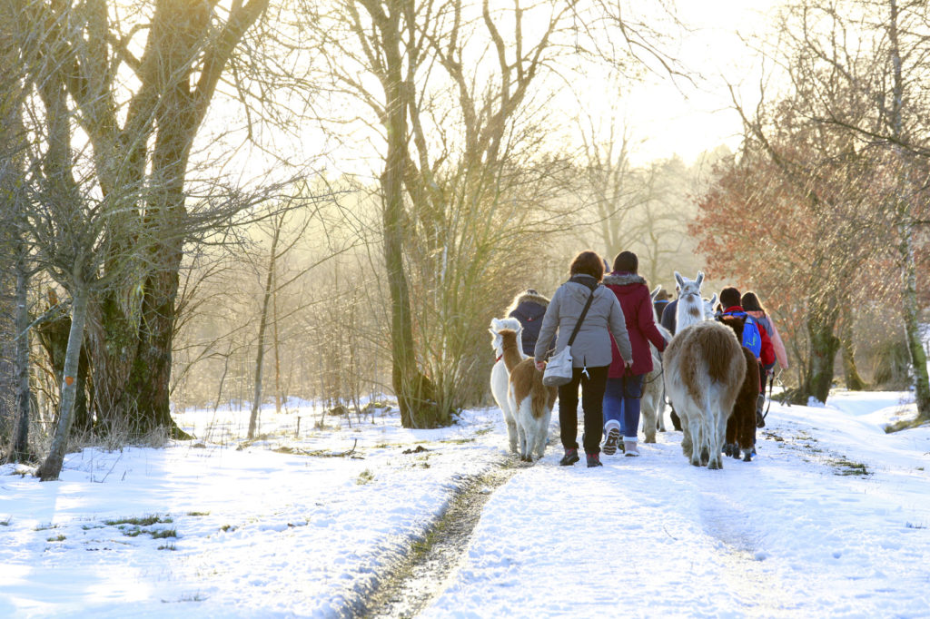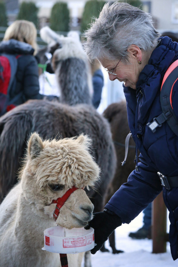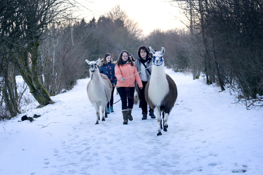 Nach einer kurzen Einführung mit Informationen zur Herkunft, dem Verhalten und den Eigenarten der Tiere durfte sich jeder einen vierbeinigen Begleiter aussuchen. Wie mit einem Hund an der Leine ging es los. Wir wurden gebeten, ein wenig Abstand zu den Vorgärten zu halten. Denn die Tiere verwechseln diesen liebend gerne mit ihrer Speisekammer. Die lustigen Laute der Tiere sind von weiten zu hören und unterscheiden sich von den gewohnten Tiergeräuschen. Schnell erkennt man, dass die Zeit immer unbedeutender wird, denn hier bestimmt nicht der Mensch das Tempo und es stellt sich ein Gefühl von Zeitlosigkeit ein. Zudem konzentriert man sich auf den Schritt seines haarigen Begleiters und kommt somit schnell auf andere Gedanken. Wir drehten eine große Runde abseits des Dorfes durch das Venn und trotz frostigen Temperaturen machten wir ein kleines Picknick, bei dem uns Plätzchen und heiße Getränke gereicht wurden.