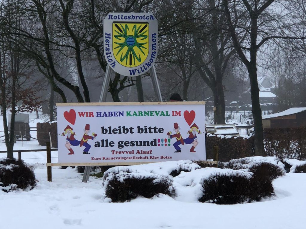 Eine tolle „leisere“ Idee gibt es derzeit am Eingang des Ortes Rollesbroich zu bewundern: Es wurden Banner mit der Aufschrift „Wir haben Karneval im Herzen – bleibt bitte alle gesund!!!!! Trevvel Alaaf! Eure Karnevalsgesellschaft Klev Botze“ aufgestellt.
