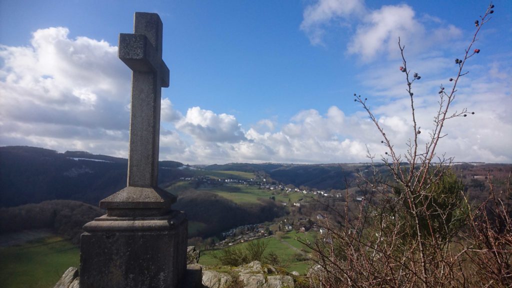 Die Vorderseite des Kreuzes zeigt auf Einruhr, die Rückseite auf Dedenborn. Auf der Querfläche über dem Sockel prangte das Familienwappen der Von Scheiblers. Auf dem Querbalken des Kreuzes stand die Inschrift „Durch das Kreuz zum Licht“ in lateinischer Sprache. Leider wurde das Kreuz im Laufe der Jahre (u.a. auch durch Kriege) beschädigt. Der Originalsockel aus dem Jahr 1887 ist noch erhalten geblieben, beim Rest vom Kreuz handelt es sich um einen Nachbau.