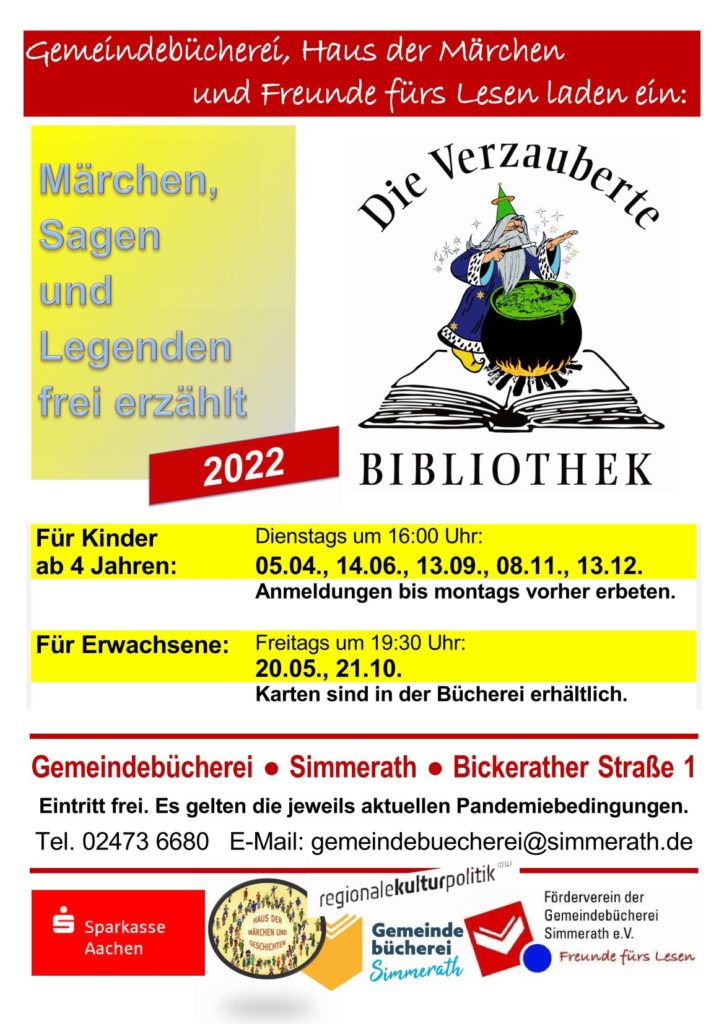 Das positive Echo im letzten Jahr und die Nachfrage nach weiteren Terminen der Veranstaltungsreihe waren groß, umso mehr freuen sich Gemeindebücherei und die Freunde fürs Lesen, dass die „Verzauberte Bibliothek“ ab April dieses Jahres eine Fortsetzung erfährt. Dank der weiteren Förderung durch die Regionale Kulturpolitik und der großzügigen Unterstützung der Sparkasse Aachen stehen auch zwei Erzählabende für Erwachsene auf dem Jahresprogramm.